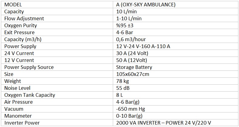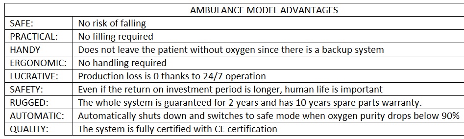 Oxygen levels in cylinders used in ambulances may be lowered at any time by a leak or breakdown, resulting in a danger to the patient’s life. In addition, there are risks in keeping oxygen tubes in the ambulance in case of an accident and the cylinders must be kept full. The necessity of frequent control of the levels and the exhaustion of oxygen in long-distance patient transfers causes difficulties.
